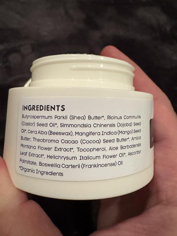 Butyrospermum Parkii (Shea) Butter*, Ricinus Communis (Castor) Seed Oil*, Simmondsia Chinensis (Jojoba) Seed Oil*, Cera Alba (Beeswax), Mangifera Indica (Mango) Seed Butter, Theobroma Cacao (Cocoa) Seed Butter*, Arnica Montana Flower Extract*, Tocopherol, Aloe Barbadensis Leaf Extract*, Helichrysum Italicum Flower Oil*, Ascorbyl Palmitate, Boswellia Carterii (Frankincense) Oil